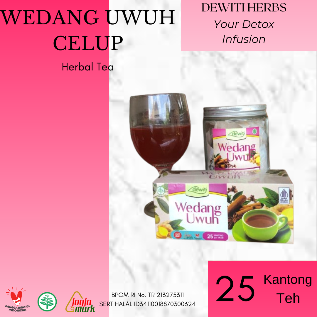 Terbuat dari campuran jahe, kayu secang, cengkeh, daun cengkeh, daun pala, serta daun kayu manis. Isi 25 kantong wedang uwuh celup.